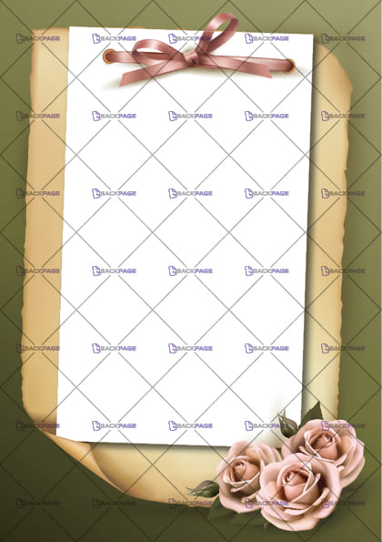 וורדים, מגילת קלף, סרט, ונייר לבן משלימים לדף רקע עדין על בסיס ירוק